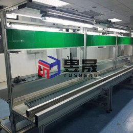 本案配置情况:2000*450*2000mm(L*W*H),三组串联,专用插件线轨道,主体框架铝材搭建,传输介质为钢制链条,手柄+丝杆调节有效传输宽度,速度可调,驱动采用知名品牌马达。配置有物料斗、绿色有机玻璃工艺看板、照明及工具滑轨、对面配套单面工作台、物料置物台,线体配备独立电箱,采用独立空开控制电源及照明开关。