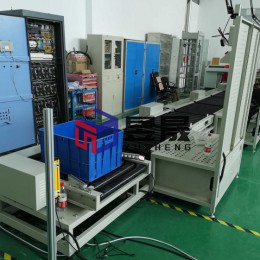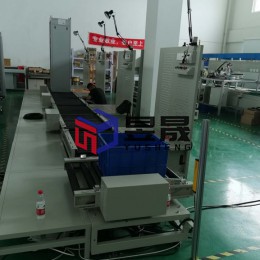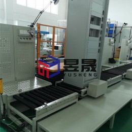 通过叉车将空柜体放在上线工位内,传感器检测到产品到位,会自动流转到装配工位内,装配工位配有带升降的人工踏台,根据操作不同位置升降高度,升降踏台与流水线互锁,装配工位带旋转,当装配过程中产品出现故障,可就地旋转将屏柜平移线外进行操作,每工位设有缓存段和装配段,均带导向装置。