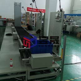 通过叉车将空柜体放在上线工位内,传感器检测到产品到位,会自动流转到装配工位内,装配工位配有带升降的人工踏台,根据操作不同位置升降高度,升降踏台与流水线互锁,装配工位带旋转,当装配过程中产品出现故障,可就地旋转将屏柜平移线外进行操作,每工位设有缓存段和装配段,均带导向装置。