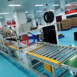 用胶带将包装纸箱的上底和下底进行封口,自动封箱机还可以自动调节对不同包装物大小的高度和宽度,适合大批量生产。产品装箱后经输送链(带、辊)送入封箱机,并递交给输箱机构,由夹箱皮带夹住纸箱的两侧面,向前运动。前短舌经压舌架自动弯曲,后短舌在纸箱进入封箱机托辊时,有一检测讯号(光电讯号)通知打舌气缸动作,由打舌架将其折弯,同时有一讯号通知熔胶机自动喷胶。纸箱继续向前运动,左、右长舌经过导向杆自动向中间折弯,同时压箱机构皮带,同步压住纸箱左右长舌,使箱、舌、胶合在一起,完成封箱整形动作,即产品包装的最后一道工序-自动封箱。