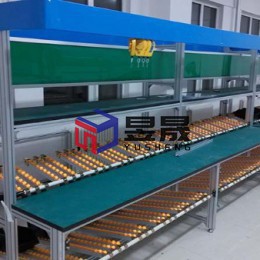 本案配置情况:8000*750(+400)*2000mm,绿色防静电台面,2000mm/单元格 配置:专用铝材支撑、配杏黄色流利条式滑道物料上料及空盒回收,单层仪表台,透明绿色有机玻璃看板及工具滑轨