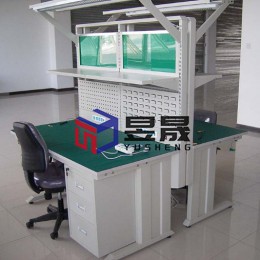 本案配置情况:1500*600*2000mm,绿色防静电台面 配置:钢制L型支架、钢制电源盒镶嵌插排、钢制冲孔工艺看板、可调高物料台、有机玻璃工艺看板、照明及工具滑轨、叁层钢制吊柜