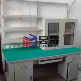 本案配置情况:1500*750*1800mm,绿色防静电重型台面 配置:钢制重型支撑、两侧配吊抽柜、中间为键盘支架、单面钢制镶嵌式电源盒、多层搁物台、右侧配双开悬吊双层柜体、照明