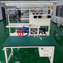 本案配置情况:2000*900*1700mm,绿色防静电重型台面 配置:钢制方钢支撑、钢制镶嵌式电源盒插座、物料盒架、单层可调高度仪表台、单侧冲孔工艺看板上下排布,看板底部可镶嵌电子触摸屏,三防照明及工具滑轨,双层钢制吊抽