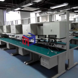 本案配置情况:1500*750*1350mm,绿色防静电台面 配置:钢制L型支撑、钢制镶嵌式T型电源盒插座、带角度物料盒挂架、单侧钢制冲孔看板、单层通长仪表台、单侧悬挂式储物工具柜、LED照明 、双层钢制吊抽