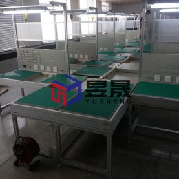 本案配置情况:线体中间为双流道环形流水线,两侧对称摆放工作台,呈非字形排布,中间线体及配套工作台传输部分为莱福伦及万向牛眼台,工作台与线体间即可形成形成大循环,工作台间也可形成小环形流水作业,整体骨架搭建为铝材,配置单层工装板,两侧配套工作台配置与线体主体协调,配有电源、物料架、工装板滑道、照明、滑道及工艺看板、工具滑轨等
