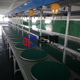 本案配置情况:环形工装板生产线,两侧上下料传输,传输介质为莱福伦,整体骨架为专用铝材搭建,双层可旋转工装板,上层为圆形,物料台侧面加装插排,选配双层物料台、气路、绿色有机玻璃工艺看板、照明、工具滑轨及拉伸器、灯饰板等