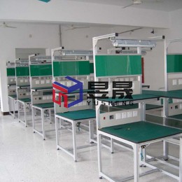 本案配置情况:600*750*2000,绿色防静电台面 配置:钢制铝材型支架、电源插座、气路、物料盒架、冲孔工艺看板(有机玻璃板)、照明、物料台 ,与生产流水线配套简单实用