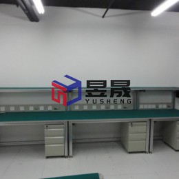 本案配置情况:1500*7500*1450, 绿色防静电台面 配置:钢制铝材型支架、电源插座、照明、物料台 ,可配移动抽屉柜,易布局,简洁大方