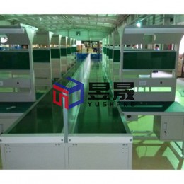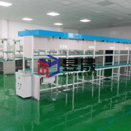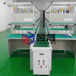 本案配置情况:飞机式配套工作台皮带线,传输介质有效宽度500mm,操作面到地面750mm,两侧工作台做防静电台面处理,铝材专用框架和侧板密封处理,配有启动、急停等按钮,皮带线水平,流线清晰,工作台操作台面、仪器放置台面清晰条理,电源布局合理,注重实用,工艺看板做冲孔处理,电源按工位镶嵌,每工位配有照明及工具滑轨。
