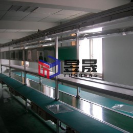 本案配置情况:长条式配套工作台皮带线,传输介质有效宽度450mm,操作面到地面750mm,两侧长条式工作台做防静电台面处理,铝材专用框架及护轨,配有启动、急停等按钮,上层为置物板,绿色工艺看板按工位布局,单面单用,电源按工位配置,每工位配有照明及工具滑轨,整体布局合理、工艺流程简明、色调搭配有较强融入性。