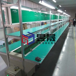 本案配置情况:长条式配套工作台皮带线,传输介质有效宽度400mm,操作面到地面750mm,两侧长条式工作台做防静电台面处理,铝材专用框架及护轨,配有启动、急停等按钮,上层为置物板,绿色工艺看板按工位布局,双边共用,电源按工位配置,每工位配有照明及工具滑轨,整体布局合理、工艺流程简明、色调搭配有较强融入性。