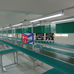 本案配置情况:长条式配套工作台皮带线,传输介质有效宽度400mm,操作面到地面750mm,两侧长条式工作台做防静电台面处理,特殊工位加装独立工作台,铝材专用框架及护轨,配有启动、急停等按钮,上层为置物板,绿色工艺看板按工位布局,双边共用,电源按工位配置,每工位配有照明及工具滑轨,环绕式灯饰板,整体布局合理、工艺流程简明、色调搭配有较强融入性。