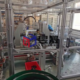 将人工摆好托盘的产品放在生产线的上料端,上料机械手将待组装的产品自动抓取到高精密传输线的工装治具内,PCB上料机械人将产品装入外壳内,启动自动螺丝机将PCB板固定在外壳上,通过精密传输线运转到焊接工位,三轴机器人完成焊锡焊接,精密流水线继续运转,上盖自动上料机构将上盖放在治具内的产品上,通过智能相机及其压装装置,完成成品的装卡,成品完成后下料机械手将产品自动装入托盘内,等待人工将产品拿到测试老化间完成后续流程。