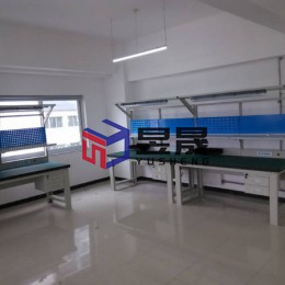 本案配置情况:1600*750*1910mm,绿色防静电高分子台面 配置:钢制重型架支撑、钢制T型电源盒镶嵌电源、钢制冲孔看板并做蓝色喷塑处理,下支架及工艺看板可装电源,单层钢制仪表台,顶部灯架悬挂LED照明,独立开关控制,轻型/中型抽屉可选