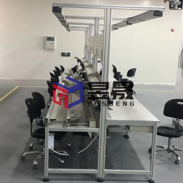 本案配置情况:2000*450*2000mm(L*W*H),多组串联,专用插件线轨道,主体框架铝材搭建,传输介质为钢制链条,手柄+丝杆调节有效传输宽度,速度可调,驱动采用知名品牌马达。配置有物料斗、绿色有机玻璃工艺看板、照明及工具滑轨、对面配套单面工作台、侧立柱按工位配备显示器多功能支架,物料置物台,线体配备独立电箱,采用独立空开控制电源及照明开关。