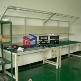 本案配置情况:1500*750*2000mm,绿色防静电台面 配置:方钢支架、钢制电源盒镶嵌插排、物料盒挂架可调高物料台、钢制工艺看板、照明及工具滑轨、双层钢制吊抽