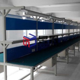 本案配置情况:15000*1500*1900mm,双边对坐工作台线,1500mm/工位,共20工位,绿色防静电台面 配置:钢制方钢支撑、钢制冲孔工艺看板两面共用,镶嵌插座、搁物台、蓝色有机玻璃工艺看板、照明及每工位配双层吊抽