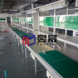 本案配置情况:中间直线传输与两侧平行直线传输呈非字形排布搭建模式,两侧传输介质为莱福伦,纵向多工位,前端配抽屉、单层抽屉,后侧为双层搁物台、绿色有机玻璃看板、照明及滑轨,每工位布置插座电源,中间为直线型牛眼转向台流水线。