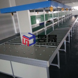 本案配置情况:环形工装板生产线,两侧上下料传输,传输介质为镀锌或不锈钢辊筒,整体骨架为专用铝材搭建,双层可旋转工装板,上层为圆形,物料台侧面加装插排,选配双层物料台、气路、绿色有机玻璃工艺看板、照明、工具滑轨及拉伸器、灯饰板等