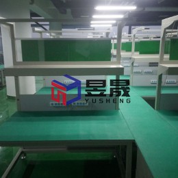 本案配置情况:16000*600*750,双边对坐,方钢支架,绿色防静电台面 中间为双边对坐,两边配套配灯架独立工作台,呈非字形排布, 配置:方钢支架、两侧工作台从中间位置取电,工作台配钢制带挡边置物台、绿色有机玻璃工艺看板、照明