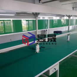 本案配置情况:15000*1600*2000,双边对坐,方钢支架,绿色防静电台面 配置:立柱固定插排及灯开关,置物台、绿色有机玻璃工艺看板、照明 、单层悬吊抽屉和灰色灯饰板