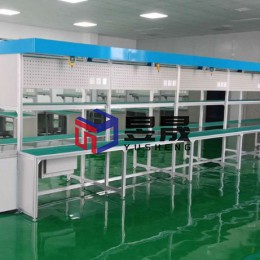 本案配置情况:长条式配套工作台皮带线,传输介质有效宽度400mm,操作面到地面750mm,两侧工作台做防静电台面处理,铝材专用框架及护轨,配有启动、急停等按钮,上层为置物板,工艺看板做冲孔处理,电源按工位镶嵌,每工位配有照明及工具滑轨,环绕式灯饰板,整体布局合理、工艺流程简明、色调搭配有较强融入性。