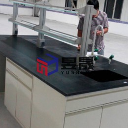 本案配置情况:钢木结合中央实验台,全钢支架,配开门柜及抽屉、实芯理化板台面,立柱内侧固定电源、双层器皿架、配套品牌水龙头及水槽