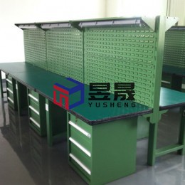 本案配置情况:1200*1200*1800mm,双面对坐,绿色高分子耐磨台面 配置:钢制重型架及落地柜支撑、钢制冲孔看板,下支架及工艺看板可装电源,顶部灯架悬挂LED照明,独立开关控制